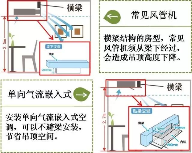 想在有横梁的房间安装家用中央空调,可以考虑做吊顶,但是如果房间的层高不够,设计上吊顶会使房间变矮,让人觉得压抑、不舒服。