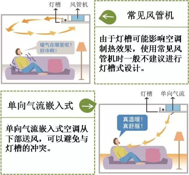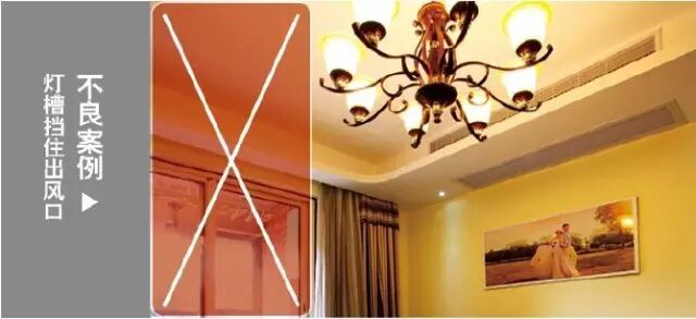 01灯槽式设计,易影响空调出风效果。很多设计师只考虑装修而忽略了家用中央空调的效果,在空调出风口前设计太宽或太高的反光灯槽,虽然美观,但是会阻碍空调气流的流畅循环,特别是冬天,影响制热效果。