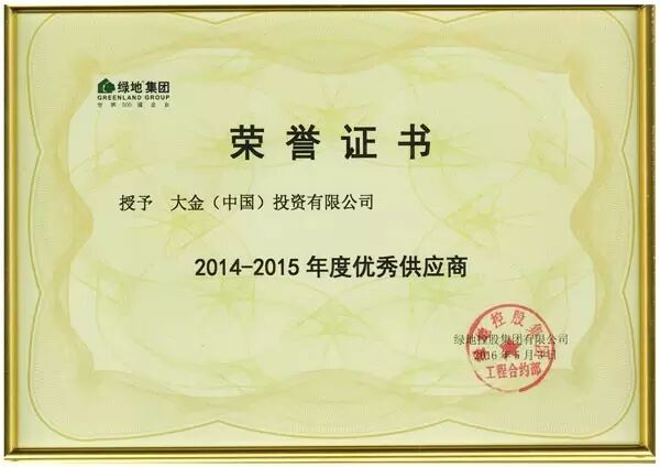 济南大金中央空调 大金空调荣获绿地集团 “年度优秀供应商”荣誉称号