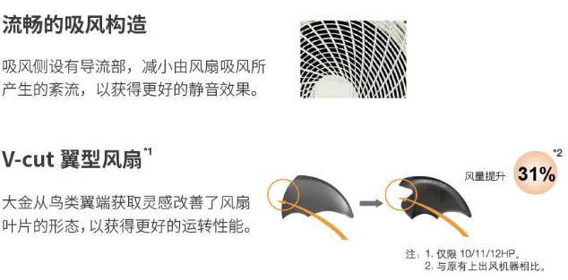 大金从鸟类翼端获取灵感改善了风扇叶片的形态,室外机采用V-cut翼型风扇设计,运转性能提高的同时,也保证了静音的效果,不用担心室外机噪音惊扰到邻居。