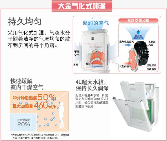 气化式加湿持久均匀,快速润泽干燥的室内空气。