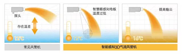 常见风管机在制热情况下,只能根据遥控器设置风力吹送热流,无法感知人体活动时的地面温度。而地面温度感应智慧眼,可以感应室内地面温度,根据感知回馈自动调节室内机运转情况及送风角度,打造舒适的体感享受。