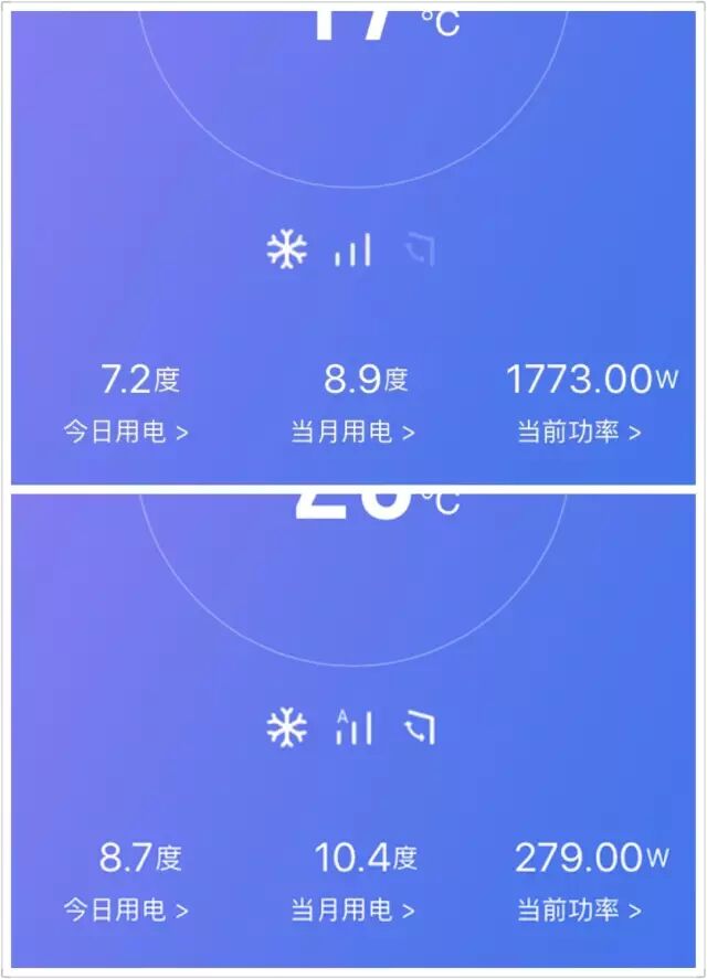 而变频空调真省电,稳定运行后只有279W的耗电量。下图可以看到,用一台设备测的一天内两台空调的耗电情况,红圈内是上午开定频空调的耗电情况,而右侧是开起变频空调的耗电,真是一天一地的感觉啊!