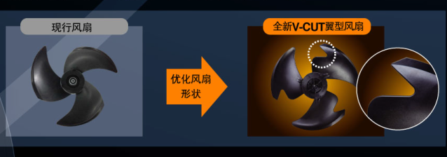 外机采用全新V-CUT翼型风扇,减少气流损耗,达到静音节能的效果。