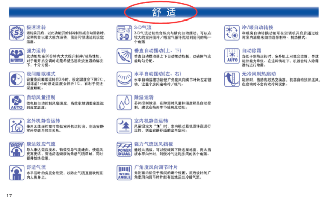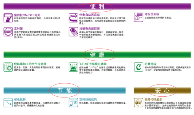 在功能方面,大金空调设计分为5大类:舒适、健康、便利、安心、节能。共20余种功能,舒适性能最为丰富,也是为用户带来最大舒适度的功能。