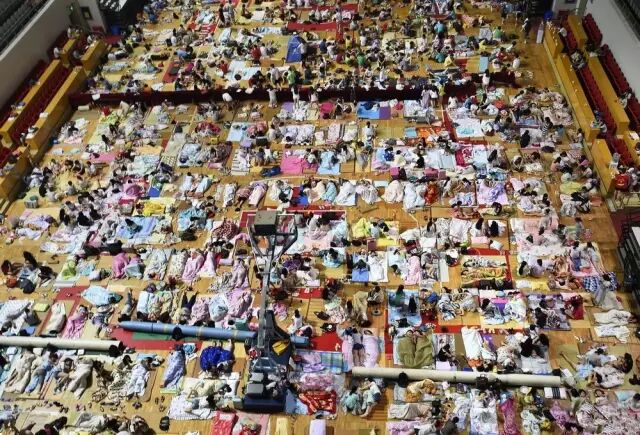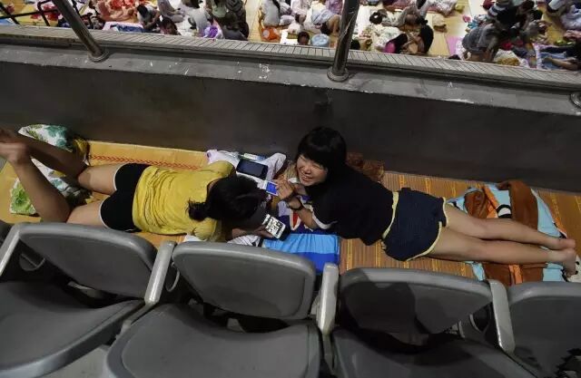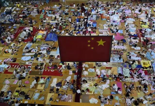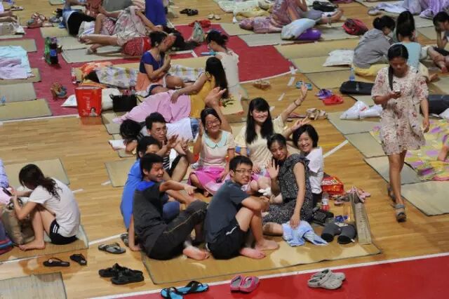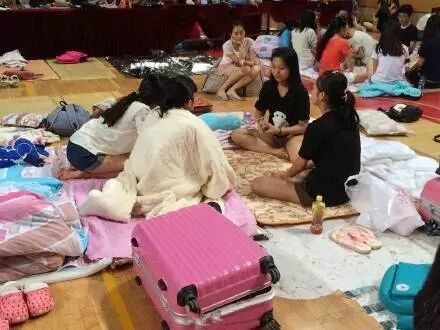 晚上10点多,体育馆里就睡满了上千名学生,还不断地有带着凉席的学生前来。