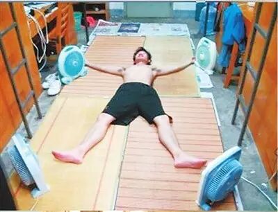 前日,湖北武汉最高气温达35度,华中师范大学开放有空调的体育馆让学生纳凉过夜。