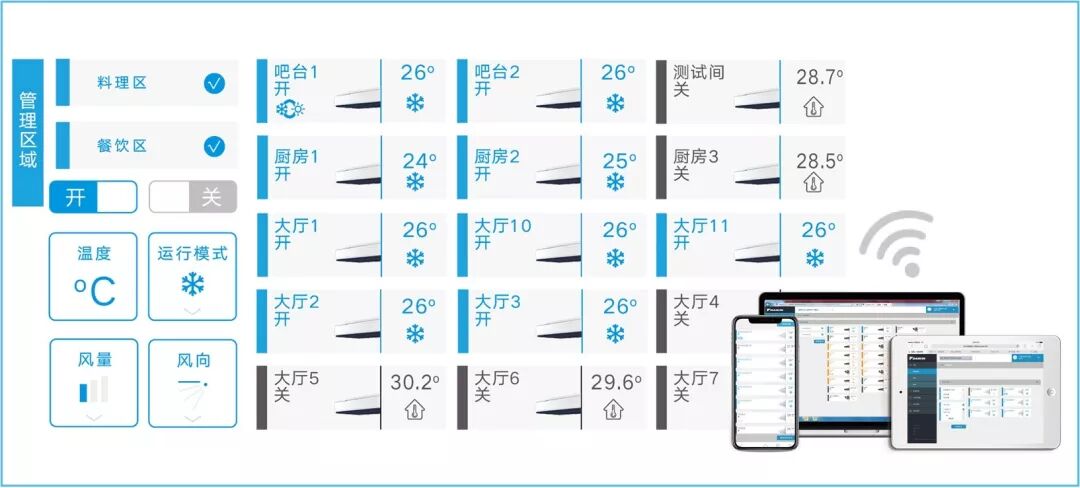 不同于传统空调的繁琐操作,VRV Intelligent寒冷地H系列操作简单,手机、平板、电脑均可登录控制界面,操作界面简洁易懂,无需专人在寒风刺骨中巡逻管理空调,根据需求可自由选择集中控制、区域控制或是单独控制。