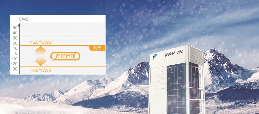 大金VRV Intelligent寒冷地H系列的连续制热运转温度最可至-25℃,即使面对严寒也毫无畏惧;不仅如此,在低温下的运转性能更是不容小觑,系统制热-15℃无衰减*,让您在严寒的冬季尽情享受舒适的源源暖意。