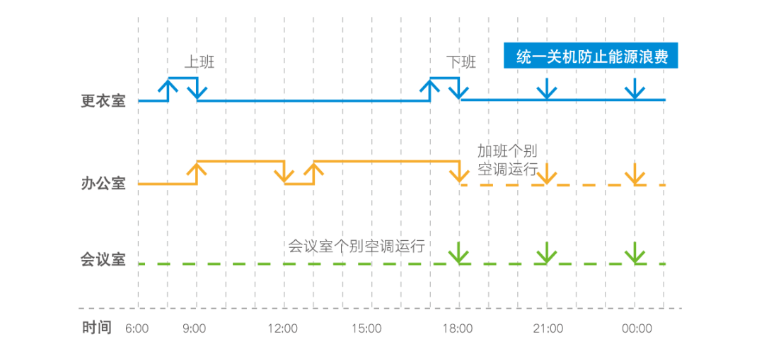 能源的浪费往往在于一些细节,商用空间复杂的构成让空调控制管理变得非常困难,常见的人为检查巡视很容易造成空调漏关忘关情况,导致无人时空调依旧保持运行状态。