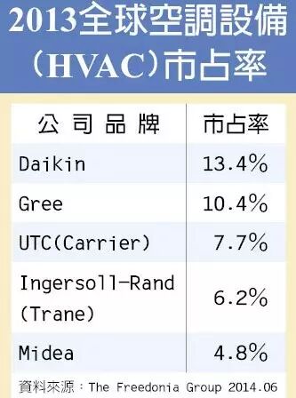 2013年 国际知名市调机构公布2013年全球空调设备销售排行,大金空调以13.4%的市占率领先其他品牌,销售金额排名全球第一。