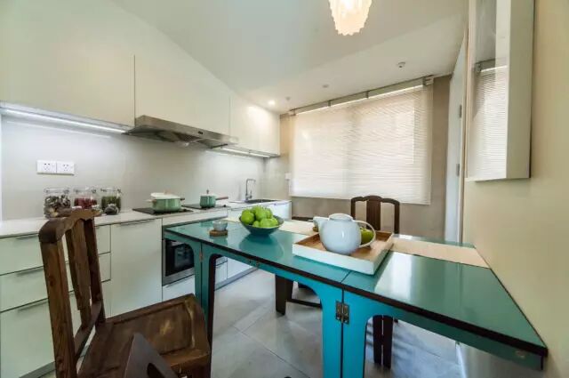 厨房和餐厅连在一块, 设计师使用了大金高耐久厨房用室内机,克服油烟难题,有效防霉,定点送风,保证在夏天也能够让易妈妈和杨老师舒适的做饭就餐,享受清凉时光。