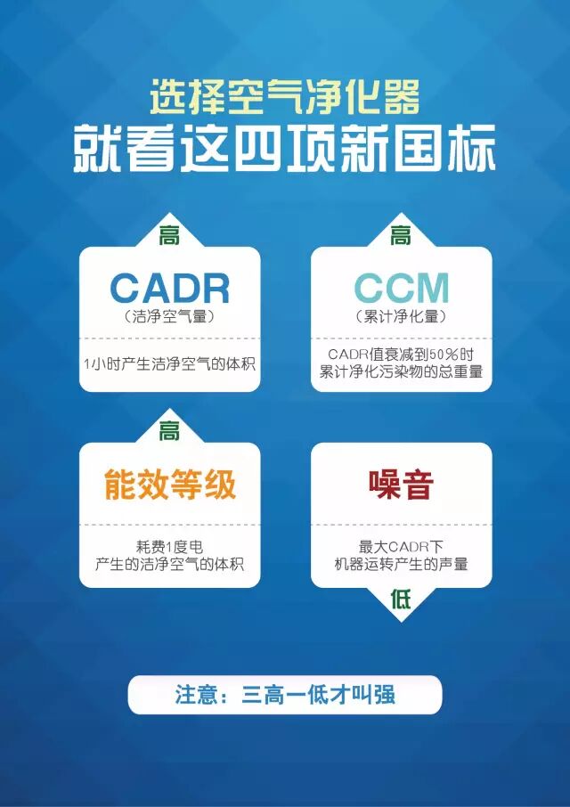 最后,在选购过程中,千万记得:空气净化器新国标实际指出,以上四项并不是CADR值越大越好,而是“三高一低”,即高CADR值、高CCM值、高能效值,低噪音才最好!才称得上是一台高品质的空气净化器!